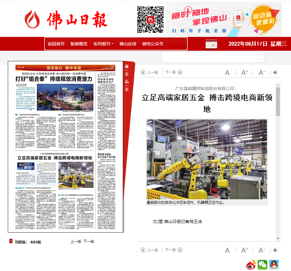 提到中國高端家居五金品牌,廣東星徽精密制造股份有限公司(下稱“星徽股份”)一定榜上有名。這個(gè)扎根佛山順德28年的本土企業(yè),依靠創(chuàng)新與品質(zhì),從鄉(xiāng)鎮(zhèn)田野走到了資本市場,成為“家居五金行業(yè)第一股”。 2019年,星徽股份成功收購知名跨境電商企業(yè)深圳市澤寶電子商務(wù)股份有限公司(現(xiàn)更名為深圳市澤寶創(chuàng)新技術(shù)有限公司,下稱“澤寶技術(shù)”),形成了五金精密制造+消費(fèi)電子研發(fā)銷售雙主業(yè)。 星徽股份副總經(jīng)理蔡文華在接待“尋找佛山經(jīng)濟(jì)新動(dòng)力”調(diào)研團(tuán)隊(duì)時(shí)透露,公司高度重視數(shù)字化智能化轉(zhuǎn)型,目前正在按照百億規(guī)?;I備建立新的智能工廠。消費(fèi)電子方面,澤寶技術(shù)也從去年的亞馬遜封號(hào)事件中逐漸走出來,建立起新的銷售渠道,并建立了國內(nèi)電商事業(yè)部,專攻國內(nèi)市場。 做強(qiáng)主業(yè) 2022年投5000萬元推進(jìn)數(shù)字化 進(jìn)入星徽股份的自動(dòng)化沖壓車間,只見到少量工人在上下料,更吸引人眼球的是排列整齊的各類自動(dòng)化設(shè)備和機(jī)器臂。它們幾臺(tái)組成一個(gè)“團(tuán)隊(duì)”,在同一條生產(chǎn)線上有序合作,每一個(gè)環(huán)節(jié)都緊密銜接且互不干擾。 “我們這里一共有500多臺(tái)機(jī)器,一般一個(gè)人能夠管控四五臺(tái)。”星徽股份銷售總監(jiān)張楊介紹道,以前沖壓車間有很多工人,現(xiàn)在大部分是機(jī)器人。